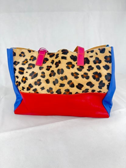 Unique colourful tote bag made from recycled leather. This handmade shoulder bag features long straps for shoulder or hand carrying and a centre zipped pocket for secure storage. No two bags are the same.